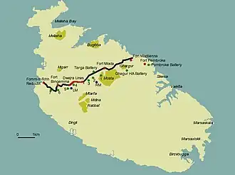 Las Líneas Victoria discurren a lo largo de una barrera geográfica natural conocida como Gran Falla, desde Madliena en el este, a través de los límites de la ciudad de Mosta en el centro de la isla, hasta Binġemma y los límites de Rabat, en la costa oeste. La compleja red de fortificaciones lineales conocidas colectivamente como las Líneas Victoria, que atravesaban el ancho de la isla al norte de la antigua capital de Mdina, era un monumento único de arquitectura militar.