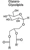 Los glicoglicerolípidos son lípidos compuestos por una molécula de glicerol unida a dos ácidos grasos y un resto azúcar por esterificaciones. Se parecen a los cerebrósidos, pero en vez de estar unido a una cerámida, el azúcar está unido a un glicerol.[9]