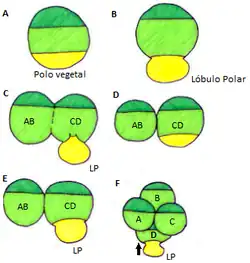 Posterior a la primera división, el lóbulo es reabsorbido por el blastómero CD. Después de esto, y antes del segundo clivaje, es formado nuevamente a partir de este mismo blastómero. Por último, al darse la segunda división, el lóbulo es incorporado al blastómero D.[1]