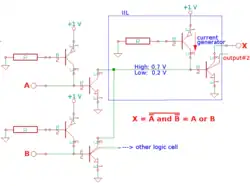 Para poder elevar la capacidad de integración, en la tecnología I²L se sustituyen las resistencias de las bases por transistores PNP con su base conectada a masa, los cuales dan corriente a la base de los transistores conmutadores, y de ahí la denominación de lógica de inyección integrada.