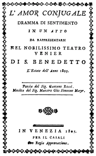 L'amor coniugale (El amor conyugal) es una farsa sentimentale en un acto con música de Simon Mayr y libreto en italiano de Gaetano Rossi, basado a su vez en Léonore, ou L'amour conjugal de Jean-Nicolas Bouilly. El texto de Boully, escrito en el año 1798, será posteriormente la base del libreto de Fidelio de Beethoven, que será musicado también en el 1805. Se estrenó, con éxito, el 26 de julio de 1805 en el Teatro Nuovo de Padua, Italia.