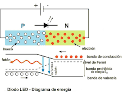 Polarización directa de la unión P-N en un diodo led. Producción de fotones como consecuencia de la recombinación entre electrones y huecos (parte superior). El fenómeno de la recombinación observado en un diagrama de bandas de energía (parte inferior)
