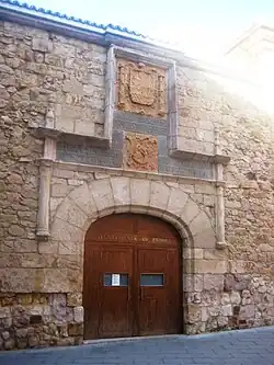 Fachada oeste de la antigua Alhóndiga del Pan, con el escudo de los Reyes Católicos. | ||