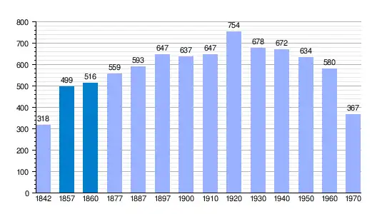 | Gráfica de evolución demográfica de La Aliseda de Tormes[3] entre 1842 y 1970 |