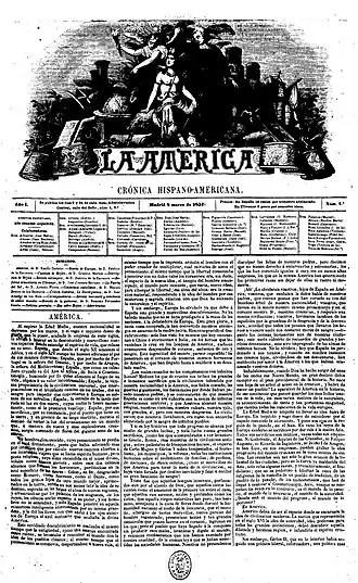 Editada en Madrid bajo el subtítulo «crónica hispano americana» empezó imprimiéndose en la imprenta de La América; después lo haría en otras, hacia 1870 estaría haciéndolo otra vez en una propia.[1] La América, fundada por Eduardo Asquerino,[2] tenía una periodicidad quincenal y sus ejemplares contaban con unas dieciséis páginas.[1] Su primer número aparecería el 8 de marzo de 1857, cada año de publicación daría lugar a un tomo.[1] Su publicación alcanzó al menos hasta el 13 de julio de 1886.[3][4]
