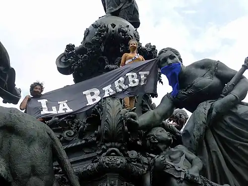 - ↑ Marina Fabre, « La Barba se paga Fabius y Joffrin, Las Noticias News, 5/10/2015 ; Céline Auguste, « Cop 21, las feministas de La Barba se invitan sobre escena a Ciencia-Po », Metro News, 03/10/2015