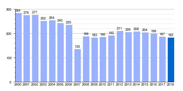 | Gráfica de evolución demográfica de La Caleruela[5] entre 2000 y 2018 |