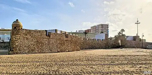 Tras la terrible invasión anglo-holandesa a Cádiz en 1596, se decide fortificar la ciudad, rodeándola de murallas y construyendo varios baluartes defensivos a lo largo del siglo XVII. La playa sigue rodeada de esa muralla y se conserva la Puerta de La Caleta, que forma parte del baluarte del Orejón, y a su derecha se encontraban el de San Pablo y más adelante el de San Pedro, del que todavía queda una garita.
