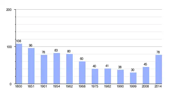 Los datos demográficos contemplados en este gráfico de la comuna de La Chapelle-Haute-Grue[4] se han cogido de 1800 a 1999 de la página francesa EHESS/Cassini, y los demás datos de la página del INSEE.[5]