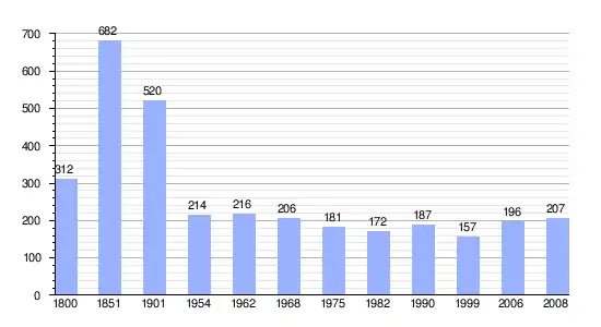Los datos demográficos contemplados en este gráfico de la comuna de La Chapelle-de-Mardore[4] se han cogido de 1800 a 1999 de la página francesa EHESS/Cassini, y los demás datos de la página del INSEE.[5]