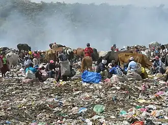 En el vertedero confluyen a un mismo tiempo los 1500 churequeros, los camiones de recogida de basuras, la maquinaria de nivelación y los empleados de la Alcaldía, más unos 60 carros tirados por uno o dos caballos que sirven para el transporte de materiales a los centros de acopio y con doscientas vacas cebú que “pastan” allí diariamente. Todo ello unido al humo permanente que surge de la basura y a los centenares de zopilotes carroñeros que acuden a alimentarse sin mayores dificultades.
