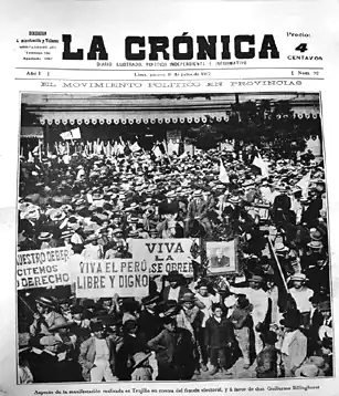 La Crónica fue un diario peruano, editado en Lima como tabloide, siendo el primero de este género impreso en el Perú, y el único que en una época dio a la publicidad tres ediciones diarias (La Crónica, La Segunda y La Tercera). Recurrió también al formato llamativo e inició la publicación de suplementos. Circuló de 1912 a 1990. Fue siempre un diario ligado al poder político de turno, aunque no incidió mucho en el tratamiento de la información política y se orientó más a las campañas de interés popular, las noticias policiales y los deportes.[1][2]