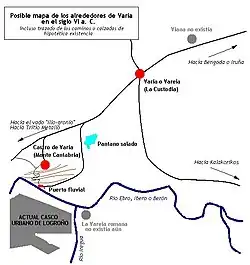 Según las modernas hipótesis, el conjunto arqueológico se completa con los restos existentes en el cercano lugar denominado Monte Cantabria de Logroño que podrían corresponder al castro defensivo de esta ciudad y seguramente a su puerto fluvial anterior al existente romano,[1] ya que el Río Ebro era navegable desde Tortosa hasta Varia al menos hasta el siglo XI d. C.