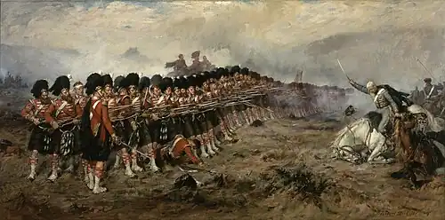 Según algunos testimonios (aunque hay versiones diferentes), el 93.º realizó hasta tres descargas de munición a 730, 460 y 320 metros, y no un único disparo a quemarropa (como en la batalla de Minden, en 1759). Sin embargo, la densidad de fuego era baja, por lo que a pesar de algunas bajas infligidas a los rusos, estos continuaban cabalgando hacia la línea británica. Pero el general ruso, viendo lo delgada que era la línea de infantería que se les enfrentaba (considerada generalmente incapaz de frenar una carga de caballería), dedujo que eran solo una trampa y que les aguardaba tras esa fila de soldados una fuerza mucho mayor, por lo que ordenó una retirada.[2]​ Viendo esto, algunos de los Highlanders iniciaron un contraataque, pero Sir Colin lo frenó al grito de: «¡93º, manden al infierno todo su entusiasmo!».[2]