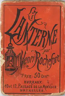 Un artículo sobre la batalla de Farsalia, contenido en el undécimo número de la revista (8 de agosto de 1868), fue interpretado por la policía como una incitación al asesinato de Napoleón III. Rochefort fue procesado y condenado a un año de prisión y multa de 10 000 francos, mientras que la revista fue cerrada. Sin embargo, Rochefort consiguió eludir la cárcel refugiándose rápidamente en Bruselas, y en la capital belga continuó la publicación de La Lanterne que, en pequeño formato, fue distribuida clandestinamente por toda Europa.[2] Esta primera serie de La Lanterne concluyó a finales de 1869.