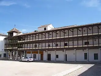 Los pueblos manchegos, que suelen ser grandes y distanciados entre sí, son extendidos, con casas generalmente consistentes en planta y piso.[56] Suelen organizarse en torno a una plaza mayor, donde se ubican normalmente la iglesia y el ayuntamiento. La iglesia suele ser el edificio más sobresaliente en los pueblos manchegos, y normalmente está realizada de piedra, pudiendo presentar mezclas de estilos arquitectónicos. Las casas suelen estar siempre enjalbegadas, esto es, encaladas, y su cubierta suele ser a dos aguas, con tejas curvas. También son típicos de la arquitectura popular manchega los molinos de viento, los chozos y cucos de piedra, y las ventas y posadas.