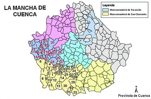 Se definen las mancomunidades del antiguo partido judicial de Tarancón (denominada "Mancha alta" conquense), y la de San Clemente (la "Mancha baja" conquense). Esta última, comprende además los municipios del antiguo partido judicial de Belmonte, hoy integrado en el de San Clemente.