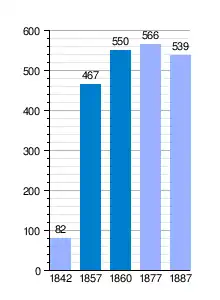 | Gráfica de evolución demográfica de Nuez de Arriba[1] entre 1842 y 1887 |