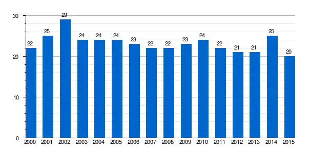 | Gráfica de evolución demográfica de La Omañuela entre 2000 y 2015 |