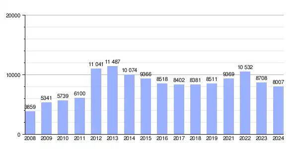 | Gráfica de evolución demográfica de La Palma del Condado[3] entre 1842 y 2021 |