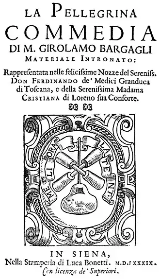 La Pellegrina. Intermedii 1589 son unos intermedios compuestos para la celebración de las bodas del Gran Duque Fernando I de Médici y Cristina de Lorena en 1589, para realzar y enfatizar el nuevo estado de su reinado. Dichos intermedios toman el nombre de la comedia a la que acompañaban, La peregrina (La Pellegrina en italiano) de Girolamo Bargagli, y con textos de G. B. Strozzi y Ottavio Rinuccini; música de Cristofano Malvezzi, Luca Marenzio, Jacopo Peri, Giulio Caccini, Antonio Anchilei, Emilio de' Cavalieri y Giovanni Bardi. El tema es el poder de la música y su influencia sobre los hombres, y todos los personajes son alegorías mitológicas como por ejemplo el cielo, la tierra, las estrellas, las musas, Apolo, etc. La práctica de insertar entretenimientos músico-dramáticos entre los actos de una obra teatral fue una práctica que se desarrolló durante el Renacimiento y el Barroco. Normalmente tenían 6 intermedios (prólogo, cuatro entreactos y un epílogo) donde se explotaban escenas convencionales de tierra, cielo, mar e infierno. El período de preparación de La Pellegrina duró 8 meses. Su estreno tuvo lugar el 2 de mayo de 1589, con una probable repetición el 15 de mayo. Incluye mucha música instrumental y vocal, muy ornamentada, madrigales, sinfonías, largas escalas policorales, y concluye con un gran ballet a la manera Francesa.