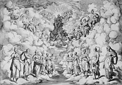 Una asamblea de dioses se regocija del regalo de Júpiter al género humano. O fortunato giorno fue cantado por siete coros que incluían por completo a la compañía.Las secciones de trío fueron cantadas por Vittoria Archilei, Lucia y Margarita Caccini. La historia fue tomada de Leyes de Platón.
