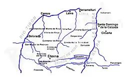 La comarca se asienta entre los Montes de Ayago al sur y los márgenes del río Tirón al oeste y norte. Al este está ya la Rioja. Y comprende los siguientes pueblos: Bascuñana, Eterna, Castildelgado, Fresneña, Ibrillos, Redecilla del Camino, Redecilla del Campo, Viloria de Rioja, Cerezo de Río Tirón, Fresno de Río Tirón, Avellanosa de Rioja, Quintanilla del Monte en Rioja, Villamayor del Río, Sotillo de Rioja, San Pedro del Monte, San Cristóbal del Monte, Quintanilla de las Dueñas y la capital de la comarca, Belorado. Al menos tres pueblos llevan en su nombre el ser de Rioja, y habría que conocer cuándo se les añadió. A ellos hay que añadir los del Valle de San Vicente: Fresneda de la Sierra Tirón, San Vicente del Valle, Santa Olalla del Valle, Pradoluengo, Santa Cruz del Valle Urbión, Soto del Valle, San Miguel de Pedroso, Garganchón, Valmala, Alarcia, San Clemente del Valle, Espinosa del Monte en Rioja, Villagalijo y Ezquerra.