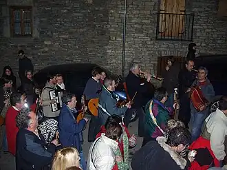 Y con todos ellos, hace sonar la Ronda pasodobles, polkas y mazurcas; las viejas danzas del Pirineo -el Tin-tan, el Cascabillo, los palotiaus...- y otras músicas que desde cualquier lugar del mundo han sabido llegarles al corazón; piezas tradicionales, o de nueva creación; canciones, bailes... y alguna jota. Ronda al estilo de la montaña: ante una puerta se canta, ante otra se baila... y en todas se come, se bebe y se charra con tantos amigos, parientes y vecinos que hoy viven lejos y a los que hacía un año que no se veía.