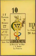 - La rueda tiene una manivela y, en otros tarots, tiene dibujada las letras T, A, R, O o las letras del alfabeto judío que forman las letras de Yahve y en círculos más interiores los símbolos del mercurio, el azufre y otros dos, elementos alquímicos por naturaleza.[1]