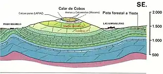 Por otra parte, respecto a la geomorfología y topografía que presenta el Calar del Cobos, se configura con curvas de nivel de aspecto concéntrico, que se corresponden, precisamente, con la ubicación de estos 2 grandes grupos de paquetes de dolomías (nº 1 y nº 2); además de un tercero, para el nivel de calizas puras, solidario con un último nivel de arenas y calizas del Mioceno. En este tercer nivel solidario es donde se centran las principales formas kársticas (lapiaz, dolinas, uvalas, etc..); y la zona de máxima recarga del acuífero-Cobos, que en la cima genera algunos de los pequeños veneros que abastecen a los numerosos tornajos de superficie, para el abastecimiento del ganado caprino.