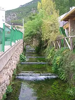 Sobre un escarpado farallón de dolomías se abre una profunda sima a ras del suelo, desde la que escapa un importante y estruendoso torrente de agua mundo y cristalino, que atravesando el núcleo de la pedanía, se precipita sobre la ladera a más de 100 metros. Formando una fantástica cascada principal de agua que en otra época fue mayor (cascada primaria), debido a que actualmente su caudal es aprovechado por el vecindario (y en alguna fecha no lejana fue interceptada por una turbina hidroeléctrica).