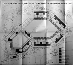La Vereda se asienta sobre la antigua finca “Cabeza de Pino”, junto a la “Vereda de la carne”, vía que comunicaba con Peñaflor y de la cual tomó su nombre. El poblado es proyectado y firmado en Madrid por José Luis Fernández del Amo en diciembre de 1963. Finalmente sería aprobado el 21 de marzo de 1964 con una serie de pequeñas modificaciones, quedando constituido por: