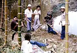 Preparando una escena, con una cámara de 16 mm. en las calles de Cali, Enrique Gutiérrez y Simón, con Hernando González -