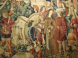 En la tapicería gótica, los autores consideraban eventos bíblicos como "históricos", y unían las narraciones bíblicas y seculares en el tejido de tapices.[26] El arte medieval ilustraba principios morales,[27] y los tapices usaban alegorías narrativas para ilustrar esta moral. La caza del unicornio secular no era simplemente arte cristiano, pero también una representación alegórica de la Anunciación.[28]