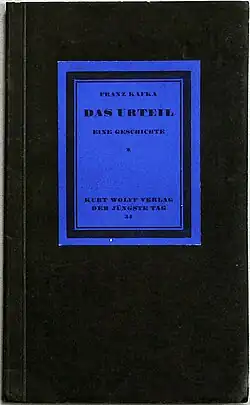 - Das Urteil. Eine Geschichte von Franz Kafka. En: Max Brod, Kurt Wolff (Hrsg.): Arkadia. Ein Jahrbuch für Dichtkunst. Leipzig 1913 (Erstdruck)
