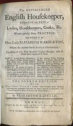 La experimentada ama de llaves inglesa es un libro de cocina escrito por Elizabeth Raffald. Se publicó por primera vez en 1769 y pasó por trece ediciones autorizadas y al menos veintitrés ediciones pirata.[1] El libro contiene unas novecientas recetas que consisten principalmente en instrucciones directas para el cocinero y no contienen listas de ingredientes. Este libro destaca por introducir la primera receta conocida para un pastel de bodas cubierto de mazapán y glaseado real y el uso temprano de la parrilla. El libro sigue siendo una referencia para los escritores de cocina.