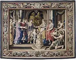 Este tapiz ilustra las concesiones en materia de impuestos instituidas por Constantino en favor de la Iglesia cristiana.[6]