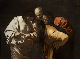 La incredulidad de Santo Tomás es un cuadro pintado por Caravaggio en 1602. Fue pintado para los Giustiniani. El cuadro muestra a Cristo resucitado ante sus discípulos, pero Tomás se niega a creer, por lo que Jesús le ofrece que toque sus heridas. El naturalismo típico de Caravaggio se hace presente aquí, al mostrar al santo como un incrédulo. Las luces, además, contribuyen a enfocar más la figura y a dotarla de realismo. La razón por la que Tomás se niega a creer, nos da a entender que él no tenía esa fe tan fuerte que tenían otros discípulos y que es necesaria para ser seguidor de Cristo.