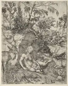La posición de la mujer desnuda evoca la figura femenina del Monstruo marino de Durero. Sin permanecer indiferente al desafío que supone la representación de cuerpos desnudos, Lucas Cranach no sigue del todo a Durero en su búsqueda de las proporciones ideales. Por otro lado, parece querer competir con él en el campo de la representación de la naturaleza, donde sobresale Durero. Mientras que este último sitúa el episodio en un paisaje mineral, Cranach confiere a la naturaleza circundante un carácter salvaje y exuberante. Añade también varios animales dispuestos en primer plano, un faisán, un cervato joven acostado y un ciervo de pie que evoca el de San Eustaquio (Durero).[1]