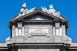 Sobre la inscripción exterior figura un escudo de armas real sostenido por la Fama (representada sin su característica trompeta) y el Genio en forma de niño. La trompeta era un atributo muy común en la fama, siendo un instrumento con el que se anuncia la magnificencia del rey. Se desconoce si la trompeta de la Fama estaba en los diseños iniciales, o si simplemente se quitó posteriormente.[39] El escudo era visible, por lo tanto a aquellos que entraban en la ciudad. El conjunto posee una similitud con el conjunto escultórico que corona el sepulcro de Fernando VI en las Salesas Reales de Madrid.[41] Se representan en el otro lado trofeos de guerra, pudiéndose observar armas antiguas entremezcladas con modernas. A pie de calle se puede observar penachos de cascos o morriones, las banderolas y estandartes desordenados que se suponen corresponden a un enemigo ya vencido. Estas representaciones alegóricas vienen a indicar el poder absoluto del rey entrante: Carlos III.