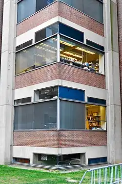 En otras de estas torres hay escaleras de emergencia. No tienen ventanas, es decir, son ciegas y están distribuidas perimetralmente alrededor de las salas de laboratorios, lo cual es algo innovador. Louis Kahn no le gustan los tubos, cables y otras “marañas” necesarios para el buen funcionamiento de las instalaciones, por lo que opta ponerlos en un lugar exterior (las torres perimetrales). Según él, da la sensación de que esas marañas tienden a crecer y destruir el edificio. A las torres les llama “las narices”, ya que también funcionan como respiraderos, sobresalen del edificio en altura y sus remates superiores son diferentes entre sí.