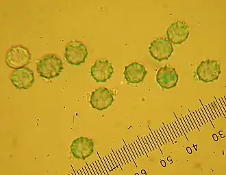 Las esporas miden 7,5-9 por 6,5-7,5 μm y tienen forma elipsoide. Su superficie está ornamentada con verrugas y crestas cortas que no forman un retículo (una red de crestas elevadas en forma de red en la superficie), con crestas de hasta 1,0 μm de altura. Las esporas son hialinas (translúcidas) y amiloides; absorben yodo cuando se tiñen con el reactivo de Melzer.[5] Los basidios (células que contienen esporas) tienen cuatro esporas y miden 42 por 9 μm.[1] La cutícula del sombrero es un ixotricodermo modificado, lo que significa que las hifas están incrustadas en una capa viscosa o gelatinosa.[5]