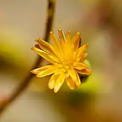 Las cabezas de las flores tienen aspecto de diente de león, se adhieren en el vértice del tallo y miden 8 mm de ancho. Los flósculos son de color amarillento o ligeramente rojo a naranja, consistiendo en 12-25 por planta. La base de la cabeza de la flor tiene varias brácteas florales de color verde claro y glabras. Las flores florecen a fines del verano o principios del otoño durante aproximadamente 3-4 semanas. La flor no parece emitir un olor notable. Después del período de floración, las flores son reemplazadas por aquenios oscuros con mechones de pelo blanco. Su aquenio tiene una cresta longitudinal, puede tener manchas negras en ambos lados y se distribuye por el viento. Son ovoides; ligeramente aplanados, pero de forma curva. Una planta puede tener brotes, flores y aquenios simultáneamente. Las raíces son unas raíces gruesas y profundas que contienen un látex blanco que es aparente cuando se corta.[7]
