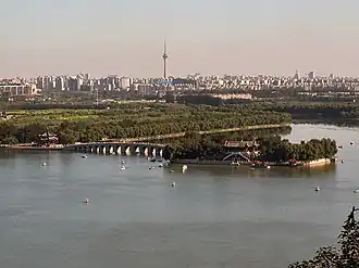 El puente principal del lago es el Puente de los Diecisiete Arcos, que conecta la orilla oriental del lago con la isla de Nanhu, que representa la mítica isla de Penglai. Cerca del puente, en la orilla oriental, hay una estatua de bronce de un toro. Según una leyenda china, Yu el Grande utilizó un toro de bronce para evitar una inundación. Como esta estatua se encuentra en dirección a la Ciudad Prohibida, parece claro que esa escultura fue instalada allí para protegerla de las inundaciones.