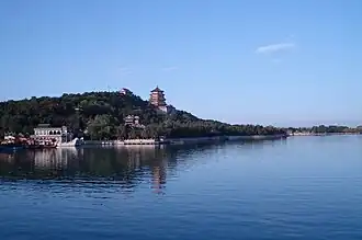 El lago Kunming es un lago artificial. Anteriormente hubo durante más de 3.500 años en este lugar dos cuerpos de agua llamados estanque Wenshan (Cerro de la jarra) y lago Xihu, que eran en aquel entonces los depósitos de abastecimiento de agua de la ciudad y para riego. En 1291, bajo la dinastía Yuan, Guo Shoujing, famoso astrónomo e ingeniero de la época, lo convirtió en un depósito de la ciudad. La conversión del lugar en un jardín imperial fue encargada por el emperador Qianlong, y las obras se llevaron a cabo entre 1750 y 1764. Cuando se crearon los jardines, la zona del lago se aumentó, utilizando para ello una fuerza de trabajo que llegó a ser de 10.000 hombres.