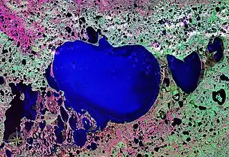 ![]() Vista de satélite del lago (NASA, falso color) | ||
