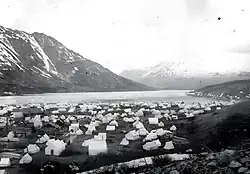 La estampida provocada por la fiebre del oro congregó en las orillas de estos lagos a miles de personas ansiosas por llegar a Dawson City antes de que el invierno se lo impidiera, y poder así optar a las mejores concesiones en las que buscar el preciado mineral. Fotografías de la época muestran grandes campamentos compuestos por numerosas tiendas de lona blanca y amplios espacios deforestados debido a la imparable necesidad de madera para construir las frágiles balsas.[4]