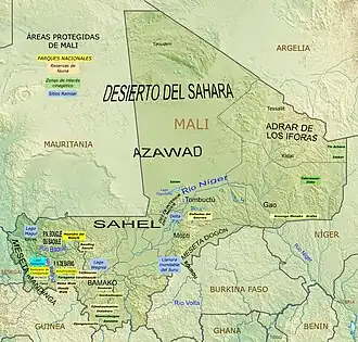 ![]() El lago Magui se encuentra en la parte sudoccidental de Mali, cerca de la frontera con Mauritania y Senegal, y drena hacia el sur. | ||