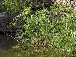 A lo largo de los bancos, lejos de las olas, se levanta una gran vegetación que penetra a las desembocaduras de algunos afluentes. Entre estas, encontramos plantas como el papiro (Cyperus papirus), que alcanza de cuatro a cinco metros de altura. El papiro, que ocupó grandes extensiones a lo largo del Nilo, hasta hace unos pocos miles de años, actualmente se encuentra fundamentalmente en el Sudán meridional y alrededor del lago Victoria, donde se extiende por grandes áreas. También se pueden encontrar, en las mismas zonas, helechos (Cyclosorus interruptus var. Striatus), el ficus (Ficus verruculosa) y plantas de la familia Alismataceae (Limnophyton obtusifolium).
