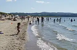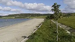 El lago cuenta con una playa artificial en la zona más próxima a la localidad, en forma de media luna y una extensión de 370 metros con zona verde y otra de arena, creada a partir de 90.000 toneladas de arena de cantera lavada. Con una temperatura media a lo largo de todo el año de 22 grados, es una de las grandes atracciones del lago.[4]